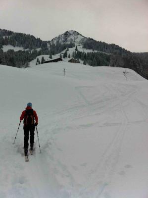 Der Aufstieg zum Roggenstock ist schon gut gespurt. Unterlage ist tip top, lediglich ganz oben am Gipfelhang gibt es an einigen Stellen Bodenkontakt. Oben war es recht zugig, dafür ging die Abfahrt trotz der aktuellen Neuschneemengen erstaunlich gut.