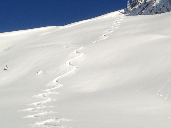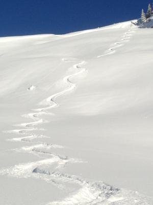 Noch einmal 20-30cm Neuschnee von Gestern. Wunderbar zum Spuren im Aufstieg und herrlich zum Abfahren.
