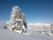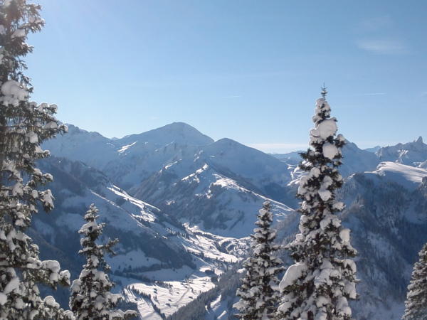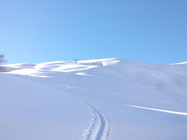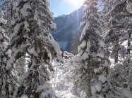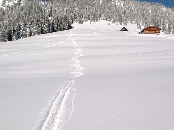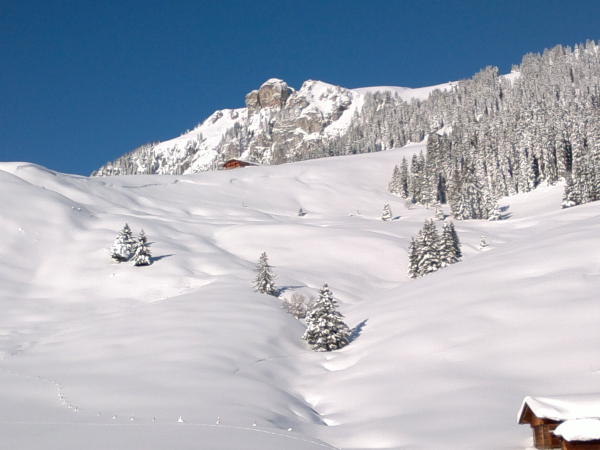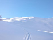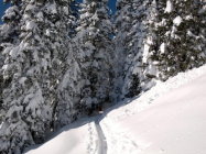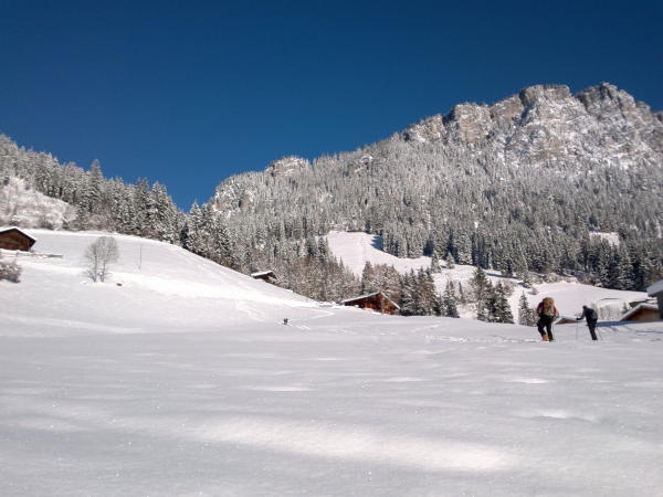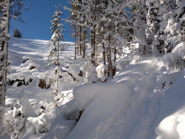 Phantastische Verhältnisse bei Traumwetter. Beim Start in Zwischenflüh zwar knackige -16 Grad, aber windstill und, sobald man in die Sonne kam, sehr angenehm zum gehen. Extrem viel Schnee für Mitte Dezember, wunderbarer Pulver von oben bis ganz unten, und noch dazu eine gute Spur. Im Gandgraben führt die Spur derzeit nicht bis ans Ende des Grabens, sondern bereits in der Mitte nach links über den Bach und dann den Hang hoch. Sollte die Spur eisig werden, wären hier Harscheisen nützlich. Jetzt geht es prima ohne.