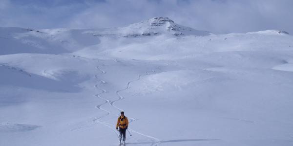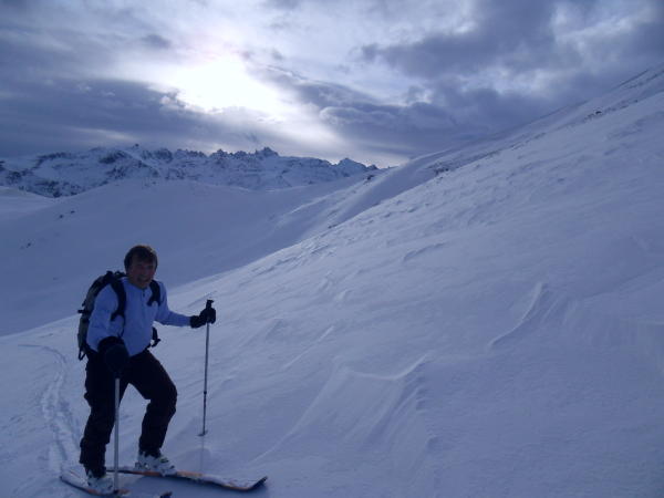 Ab Vermol Nassschnee bis auf 1500 dann schöner Pulver bis nach der Waldgrenze. Nun abgeblasen und wenig Schnee bis zum Gipfel.