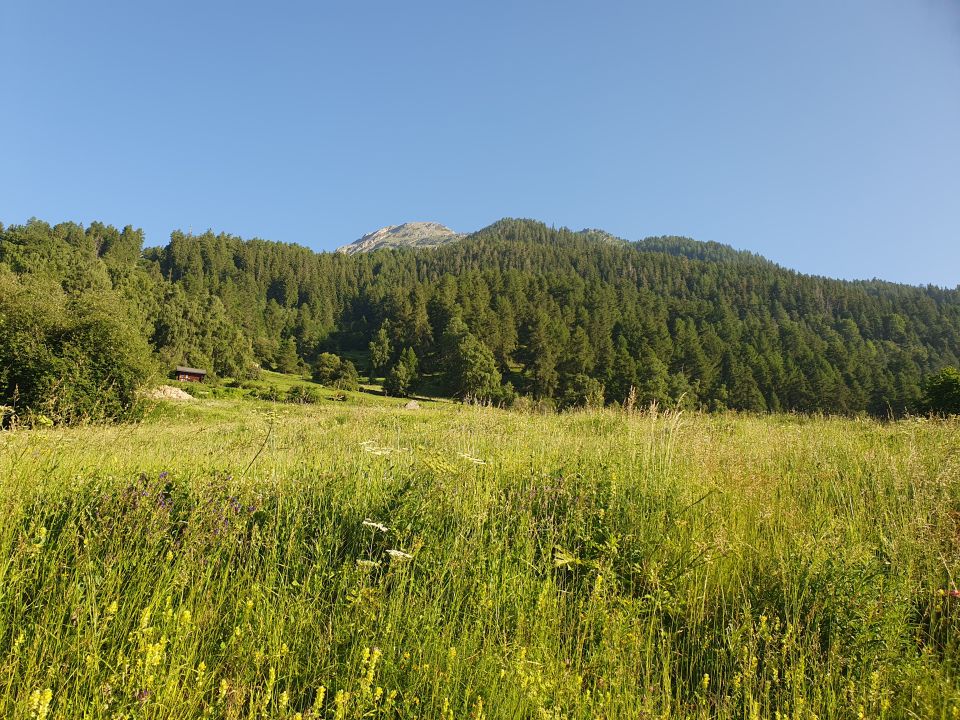 Von Susch Bis Sot Chastè habe ich die Kurven der Forststrasse immer wieder über Wiesen weglos abgekürzt. Anfänglich etwas nass mit Kuhbesuch, später ohne Kühe trockener. Die letzte Abkürzung war etwas steiler und meiner Meinung nach nicht wirklich schneller.