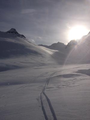 Mit der Erwärmung ist die Lawinensituation heimtückisch geworden. Da, wo die Oberfläche offensichtlich verblasen und hart ist (kein Einsinken) hält es gut. Grosse Triebschneeansammlungen in nicht frequentierten Gebieten sind unbedingt zu meiden, auch in relativ nicht steilem Gelände.