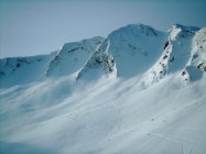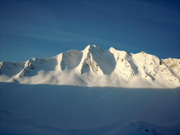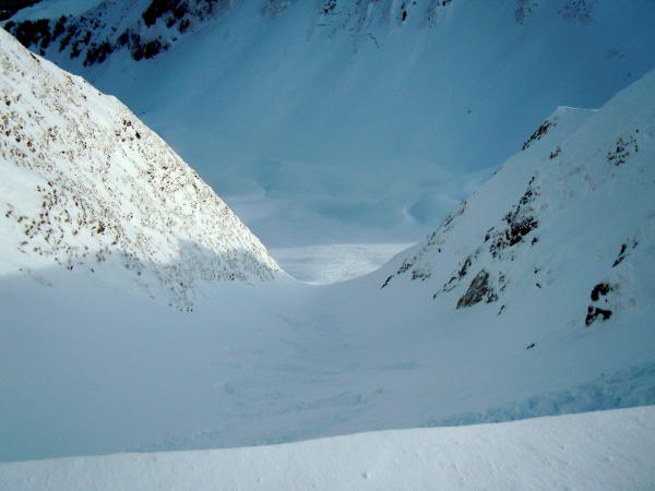 Abfahrt durch eines der Ost Couloir. Verhältnisse am Vormittag hervorragend.