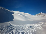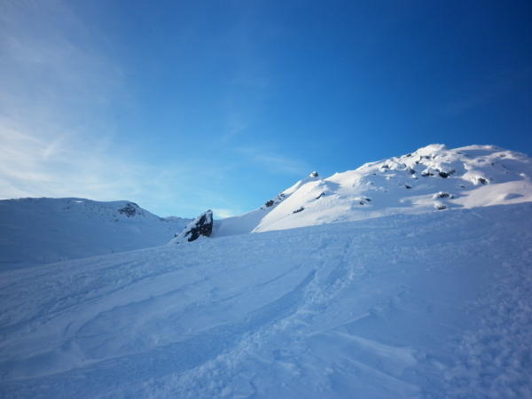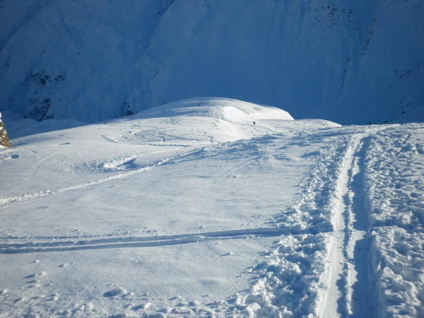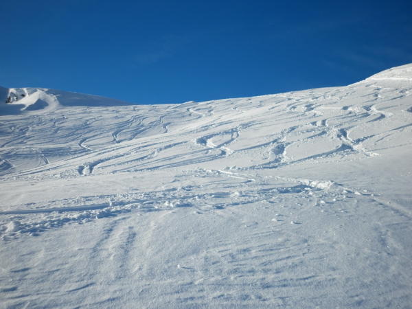 Bei der Abfahrt gute Verhältnisse und im oberen Teil recht pulvrig. Mittlerer/unterer Teil dann schwerer Pulver.