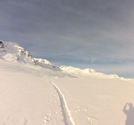 Pulverschnee mit grösseren Triebschneeansammlungen und sehr starker Wind. Vereinzelt Steinkontakt im unteren Teil.