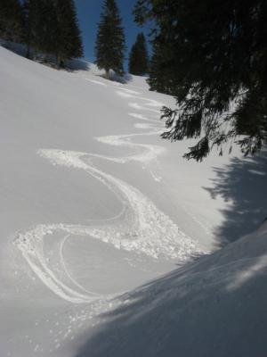 Am Steilhang ob Wieslealp, Oberflächen Bollenrutsche durch Vorausgehende bzw. in der Abfahrt.