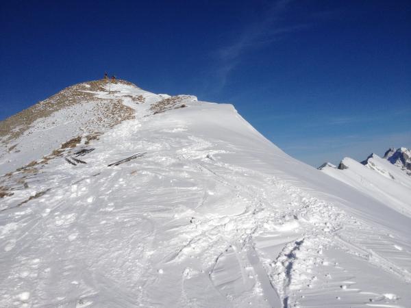 allgemein wenig Schnee und oft verblasen, besonders gegen oben. Zum Abfahren etwas unter Gipfel starten, dann aber bei guter Rolutenwahl durchaus lohnend.