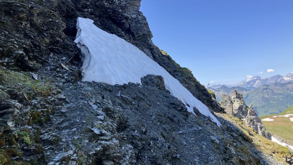 In der Querung unter dem Foostöckli gibt es noch zwei Altschneefelder in heikler Lage. Umgehung möglich, aber heikles brüchiges Gelände, eher T5.
