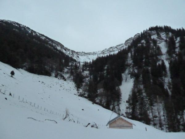 Erstaunlich wenig Schnee trotz nordseitiger Ausrichtung. Ski mussten sowohl im Waldstück nach der Hinteren Simatsgund Alpe wie auch im Aufschwung nach der Gratvorsäßalpe abgeschnallt werden.