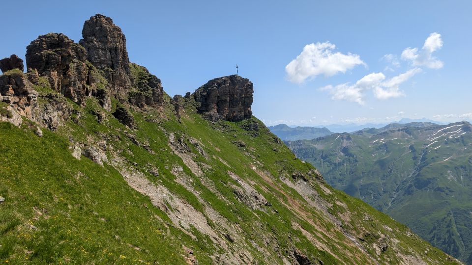 Der weitere Weg dann problemlos, inkl. Besteigung Spitzmeilen. Hier nur ein weiterer Hinweis: Das obere Ende der ersten Kette hängt an einem losen Stein. Hätte jemand an der Kette gezogen, hätte das leicht fatal enden können. Habe Stein und Kette oben zusammengelegt. Idealerweise sollte dieser Teil der Kette demontiert oder neu befestigt werden.