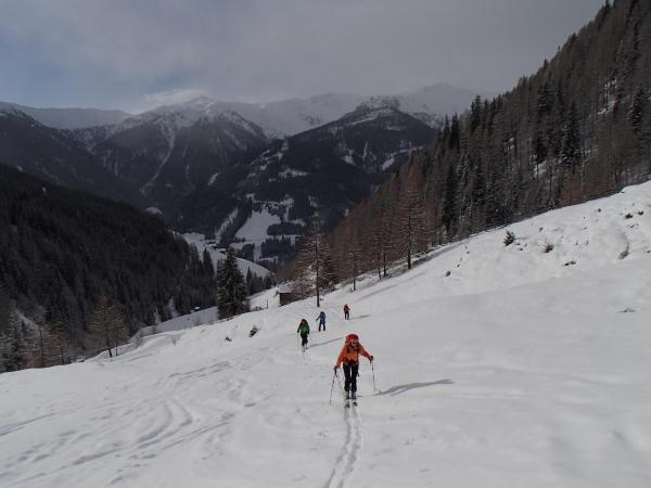 Über Nacht Schneefall, ca. 15cm auf 1700m. Dann zuerst Aufhellungen. Später leider zunehmend Eintrübung und einsetzender Schneefall (ca. ab Schmidhoferalm).