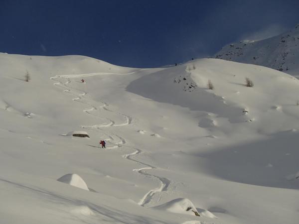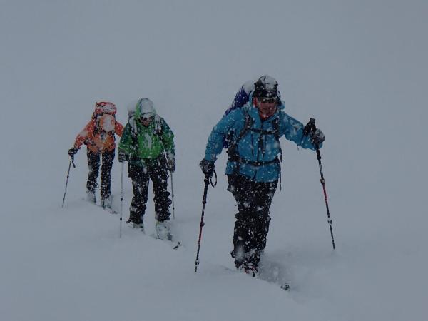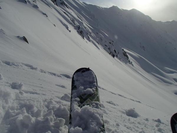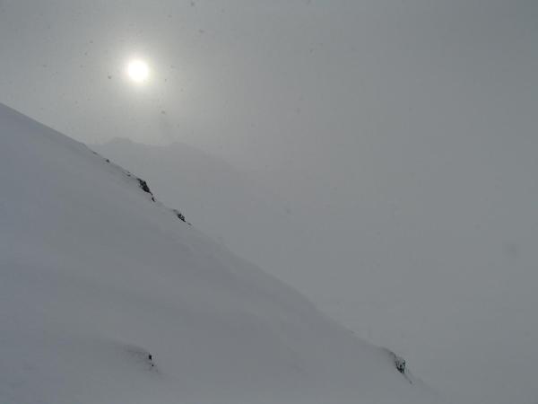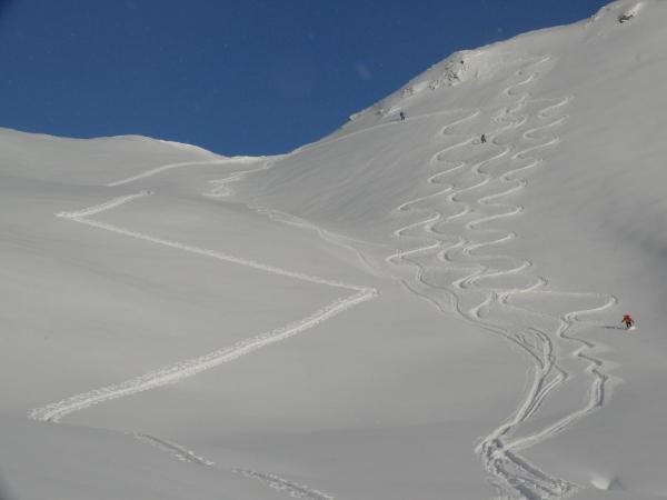 Traumabfahrt über dann noch unberührte Hänge im Fluffy-Schnee. Das Durchhalten trotz miserablem Wetter im Aufstieg hat sich voll rentiert - der Wetterbericht sollte Recht behalten.