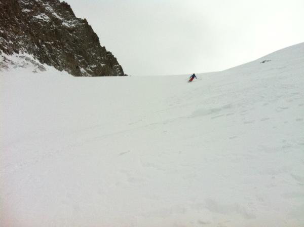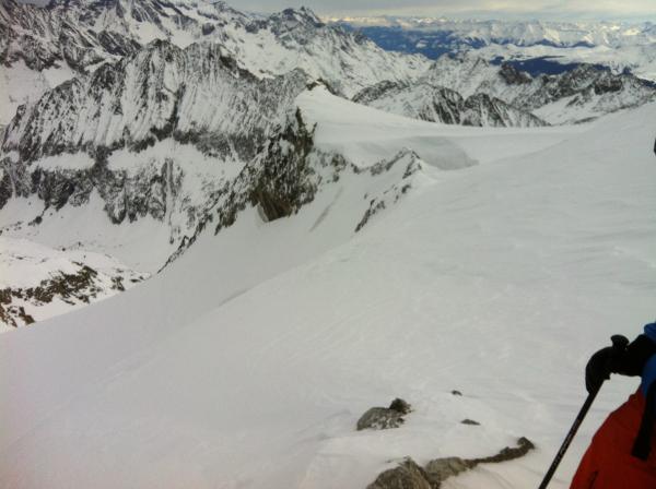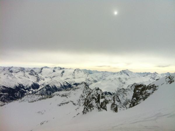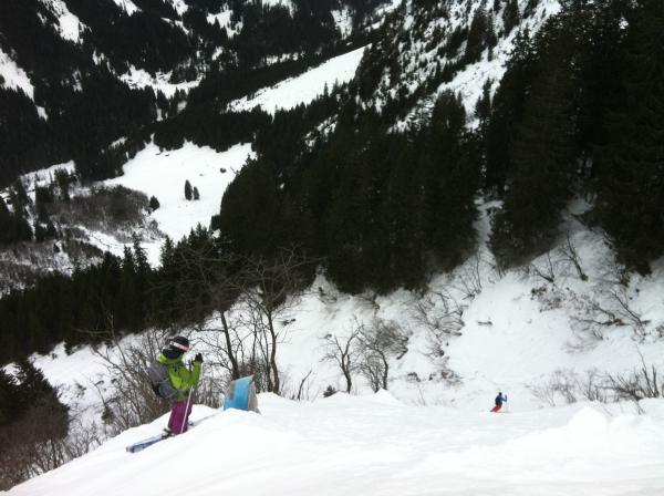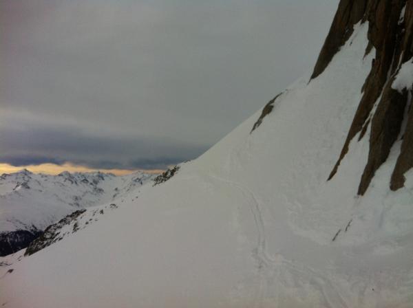 Auch auf dem Staldenfirn teils Windgepresst, teils pulvrige Abschnitte. Ab P. 2572 schöne pulver Hänge. Kurz vor der Hütte Ligegg (1834) gab es teils Hänge mit hartem Deckel aber auch schöne Hänge. Im Wald Pulver bis P. 1678.