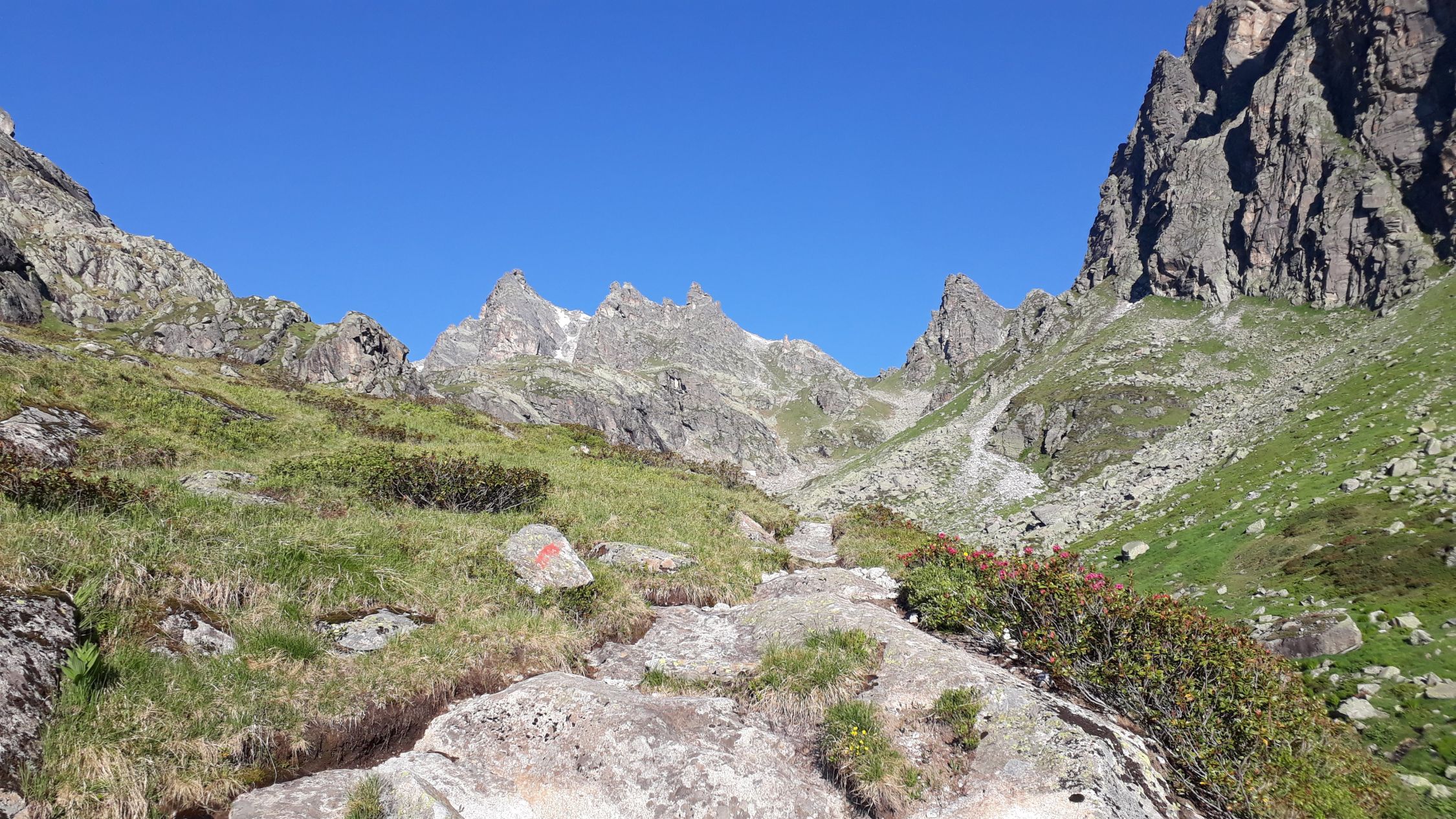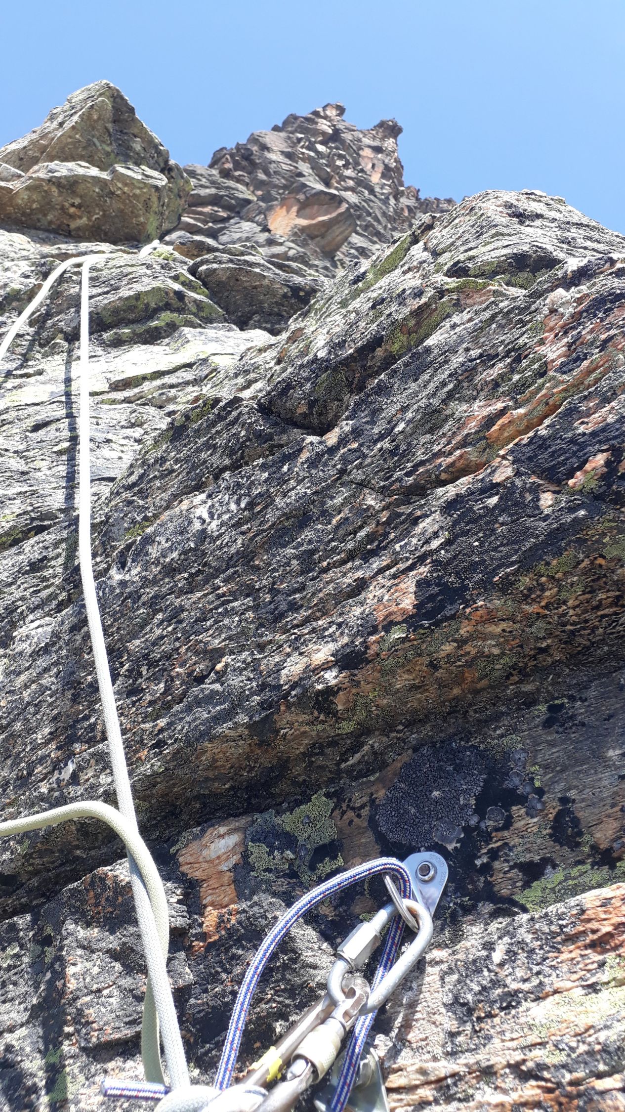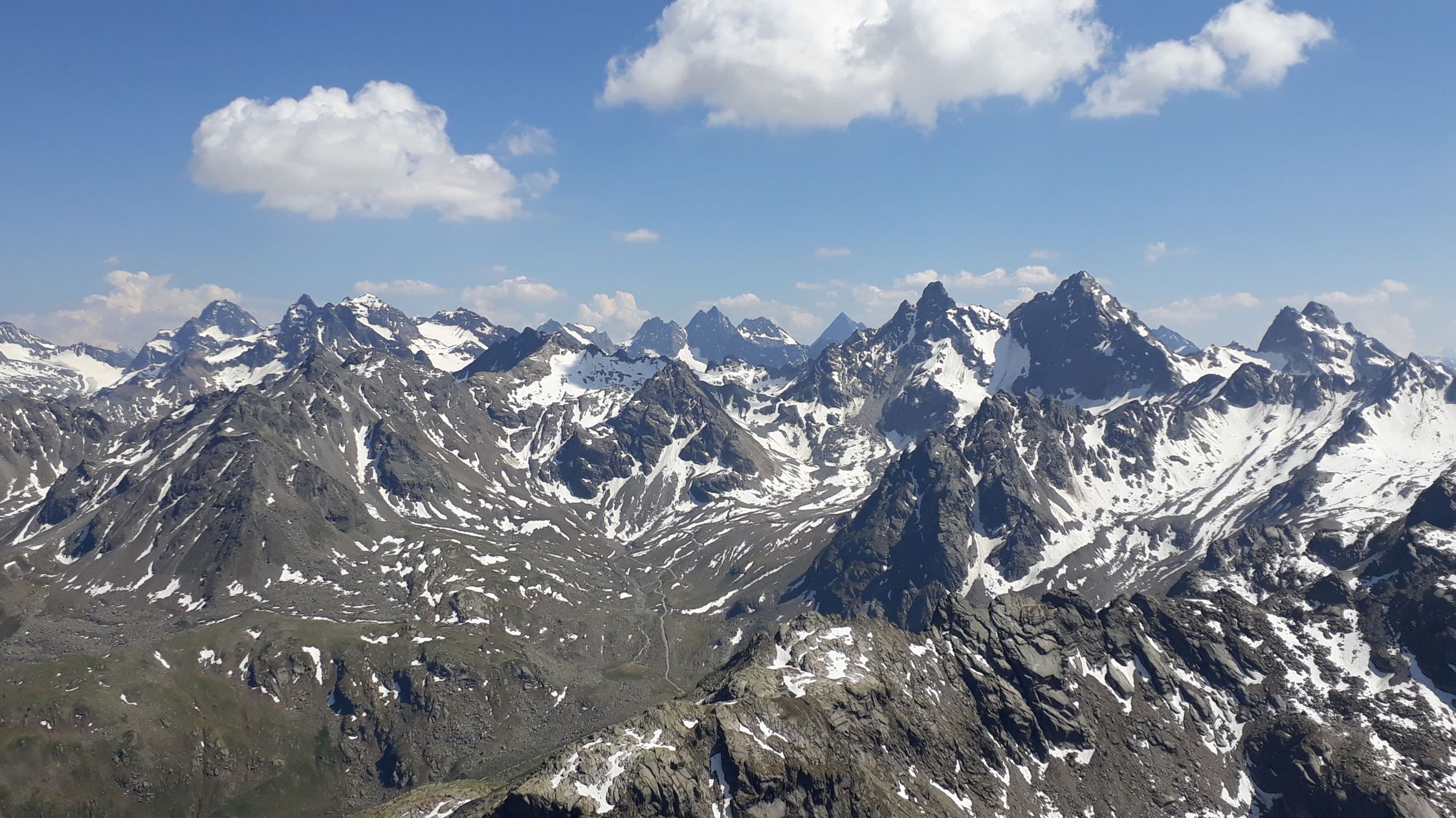 Im Augenblick sehr gute Startbedingungen für Touren von der Bielerhöhe weg. Die Silvrettastrasse ist aktuell zwischen Vermuntstausee und Partenen gesperrt, und sie kann nur von der Paznauner Seite aus befahren werden. Dafür wird keine Straßenmaut erhoben und es gibt keinen lauten Durchgangsverkehr und keine Motorräder. Himmlische Ruhe auf der Bielerhöhe! Wir sind vom Vermuntstausee, wo es gute Parkmöglichkeiten gibt, den Bergpfad ins Maderneratal hochgestiegen. Der Einstieg ist gut zu finden, auf ca. 2350m den Weg zum Hochmadererjoch nach rechts verlassen und zum Wandfuß des Südostpfeilers hinüberqueren.