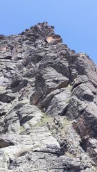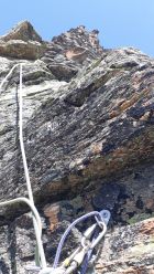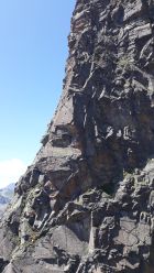 Aus der Ferne betrachtet besteht der Hochmaderer aus vielen riesigen Pfeilern, die sich nach oben hin an den Gipfelpfeiler anlehnen. Der Gipfelpfeiler baut sich vom Hochmadererjoch nach Norden auf. Er ist vom Südostpfeiler durch eine riesige Schlucht getrennt, die sich fast bis zum Gipfel hochzieht. Rechts dieser Schlucht befindet sich der Südostpfeiler und am tiefsten Punkt ist der Einstieg. Die ganze Tour ist nichts für reine Sportkletterer, da sie ziemlich alpin angehaucht ist, d.h. der Kletterschwierigkeitsgrad sagt nichts über die tatsächlichen Schwierigkeiten aus: Orientierungsprobleme, besonders im unteren, plattigen Teil lange Hakenabstände (max. 2 Haken bei 45m-Seillängen), schlechte natürliche Sicherungsmöglichkeiten. Wir sind in der 3. SL von der Route abgekommen und waren sofort in sehr heiklem Gelände, wo wir einen schwindlichen Stand aus 2 Cams bauen mußten. Wir hatten keinen Plan mehr, wo die Originalroute verlaufen sollte, zum Glück kam 20m über uns der grüne Absatz, wo fast alle eingerichteten Routen enden. Nur die SO-Pfeiler-Route geht dann noch in jetzt steilerem, aber griffigerem Gelände drei 40m-SLen nach oben. Die letzte SL ist die schwierigste, man möchte Zwischensicherungen zwischen den 3 Haken im Zehnmeterabstand legen, aber in dem plattigen Silvrettagneis geht nichts. Der 3. Haken befindet sich in der überhängenden Begrenzungswand einer steil nach oben führenden Rinne. Nicht die Rinne weitergehen, sondern beim Haken über die Begrenzungswand auf den Absatz darüber klettern. Hier befindet sich unmittelbar darüber der von unten nicht sichtbare letzte eingerichtete Standplatz. Von hier aus wieder über einen horizontalen Absatz über eine gratartige Rippe ca. drei SL (III ) nach oben. Es müssen alle Sicherungen selbst gelegt werden. Bei einem hausgroßen Block, der die Rippe versperrt, sind wird rechts vorbei (eine Stelle sehr ausgesetzt) und am oberen Fuß des Blocks nach links bis zu einem kleinen Grasband geklettert. Um die Kante herum öffnet sich ein nach SW ausgerichteter mäßig steiler Hang, der leicht links haltend ca. 150 m nach oben verfolgt wird (I-II Gelände). Wo sich das Gelände aufsteilt, gibt es eine Möglichkeit über eine weitere Gras/Felskante nach links zu queren. Um die Kante herum ist nun in nordwestlicher Richtung das Gipfelkreuz zu sehen. In steilem Gehgelände an geeigneten Stellen wieder mehrere Rinnen überqueren, um dann im schotterigen und steilen Gipfelhang bis zum Sattel kurz unter dem Gipfelkreuz hochzusteigen. Abstieg über den teils schotterigen Normalweg über ein längeres Schneefeld hinunter ins Hochmadererjoch.