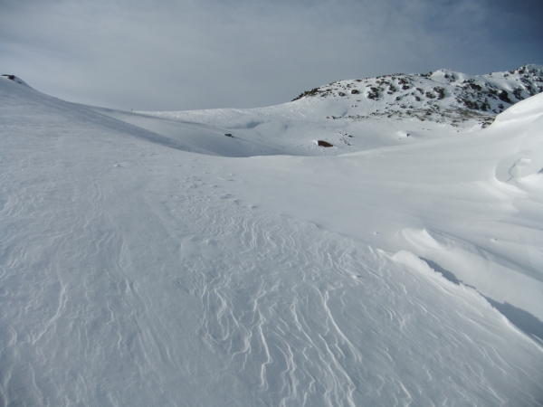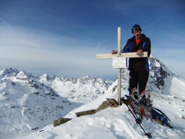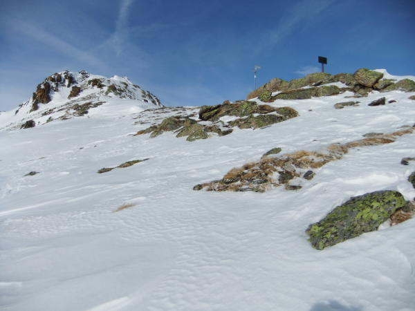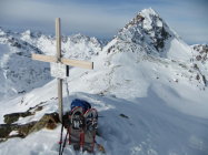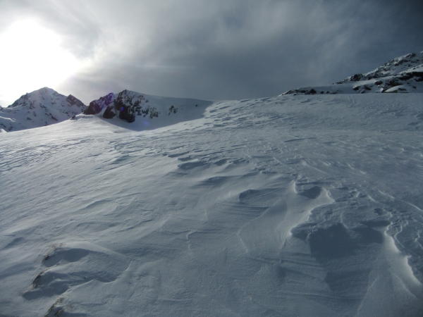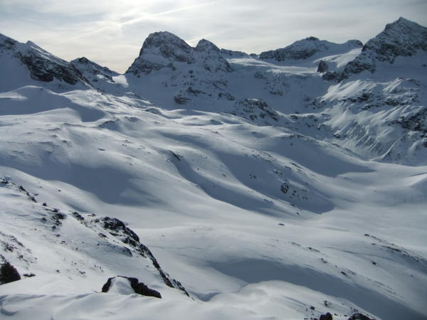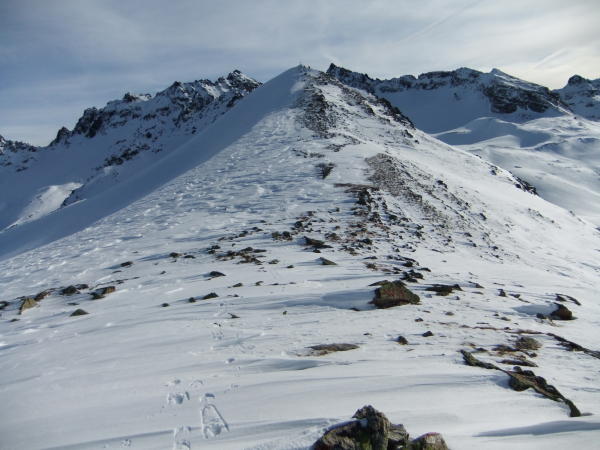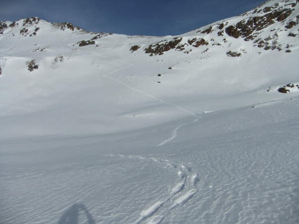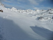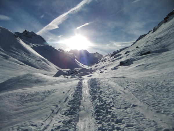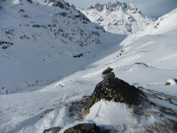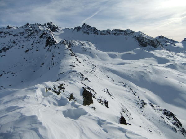 Morgens Anfang 5 Schneeschuhläufer getroffen, die zum Bieltaljoch hochzogen. Richtung Runder Kopf waren 3 Tourenskifahrer zu sehen. Im unteren Bieltal gab es reichlich Tourenskispuren. Im oberen Talbereich nur noch kaum, wegen dem Wind und Schneeverfrachtungen. Im rechten Talschluß verloren sich diese Spuren Richtung Bieltalkopf. Ab erstem Abzweig zur Getschnerscharte mußte talaufwärts und kräfteraubend zum Sattel gespurt werden bis hinab zum Ochsental.