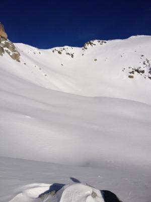 Im Aufstieg ist der Schnee gut verfestigt. Das letzte Drittel des Grats von der Lücke zum Gipfel haben wir die Skis aufgebunden. Der Aufstige geht so ohne grössere Schwierigkeiten, erlaubt jedoch keine Fehler. Die Abfahrt zum Stausee ist in Ordnung, nicht super und nicht grässlich. Die Querung überhalb des Stausees ist gut machbar, verzeiht aber ebenfalls keine Fehler.