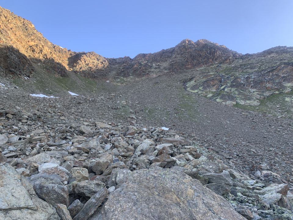 Ich hatte ein bisschen mit der Überschreitung des gesamten Triftgrats spekuliert, wusste aber nicht, ob das vom Zeitmanagement hinkommt. Beim Routenstudium wurde allerdings klar, dass das Steintälli vermutlich einen sehr einfachen Zugang zu P3517 vermittelt, wo die Route von der Almagellerhütte einbindet. Das hatte ich so als einfachste Variante geplant. Zum Triftgrat - die Informationen sind spärlich, gut aber wie immer die Beschreibung von b&s: