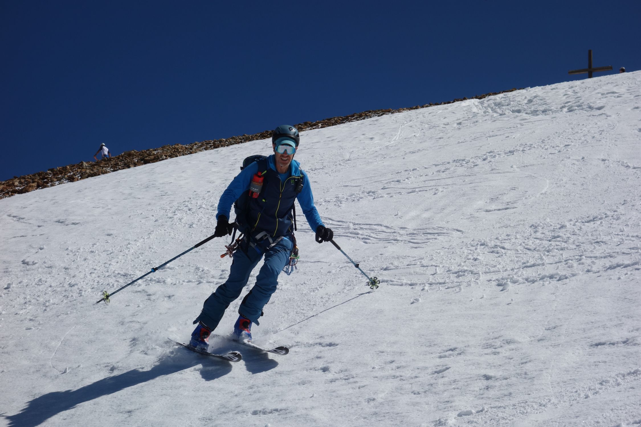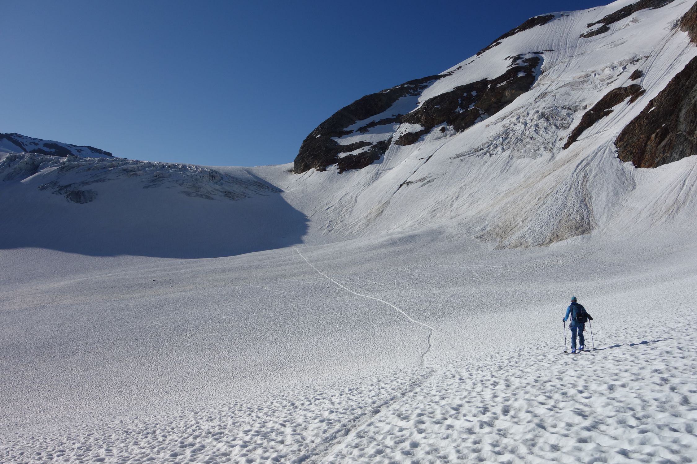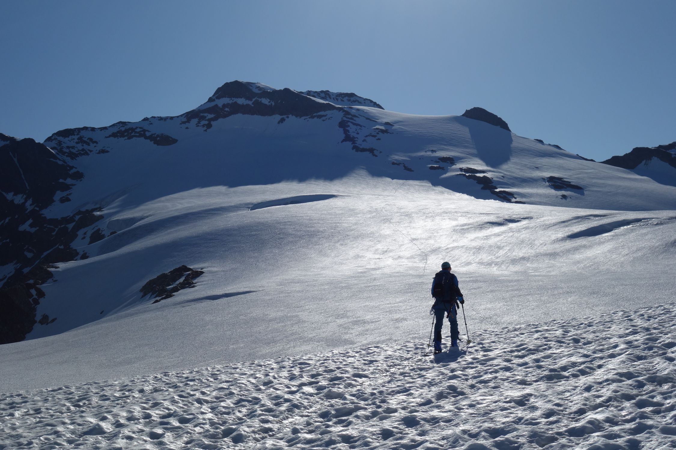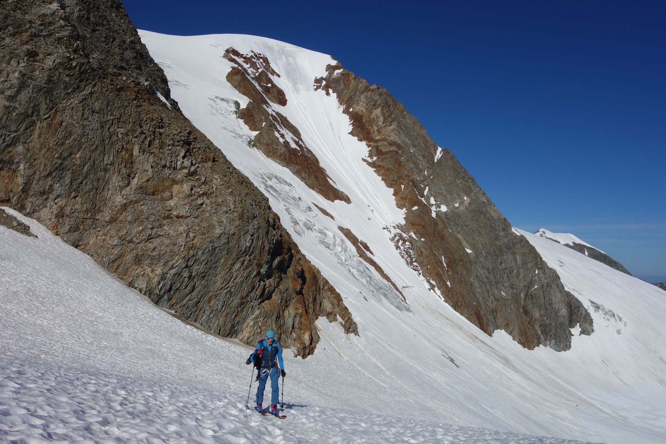 Last day of the season with light and shadow. We left at 6 from the last parking lot at the end of the private road at 2100. We walked up the path (often equipped and a bit difficult, shoes recommended) to the refuge. Then we put on skis on snow that had frozen hard thanks to the clear sky of the night despite the freezing point above 4000. Snow in bowls and frozen up to two hundred meters from the top. Not an easy climb, we put on crampons from 3100. Then a big block for the 3cm of new snow at the top. Only people on foot going up. At 1030 on the way down it had given up a bit, 4 stars at the top, two at the bottom. Here the shadows. We wanted to go down the slope on the orographic left of the refuge that you take all the way to the left going up a bit. After a bit of fiddling we gave up due to the lack of tracks and not being able to understand how much of an obstacle the ice and crevasses that could be seen halfway up the steep high slope could pose. The girl at the refuge didn't help us much, saying she didn't know the conditions but that in the last three days of great heat they had worsened a lot. End of story, great effort to walk down the ascent path and as soon as we reach the car we see two skialps (who knows where they came from?) who enter the slope and easily overcome the sections that from afar seemed more difficult, arriving ten minutes from the car .... Good dose of nerves .... But that's okay. Beautiful places, with Gabri.