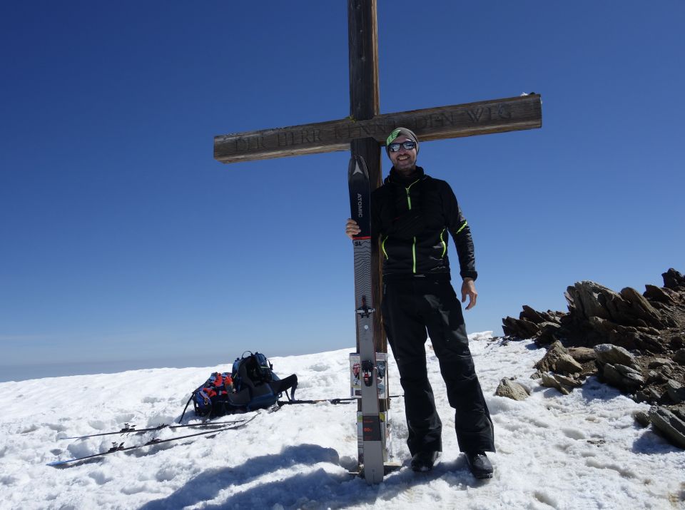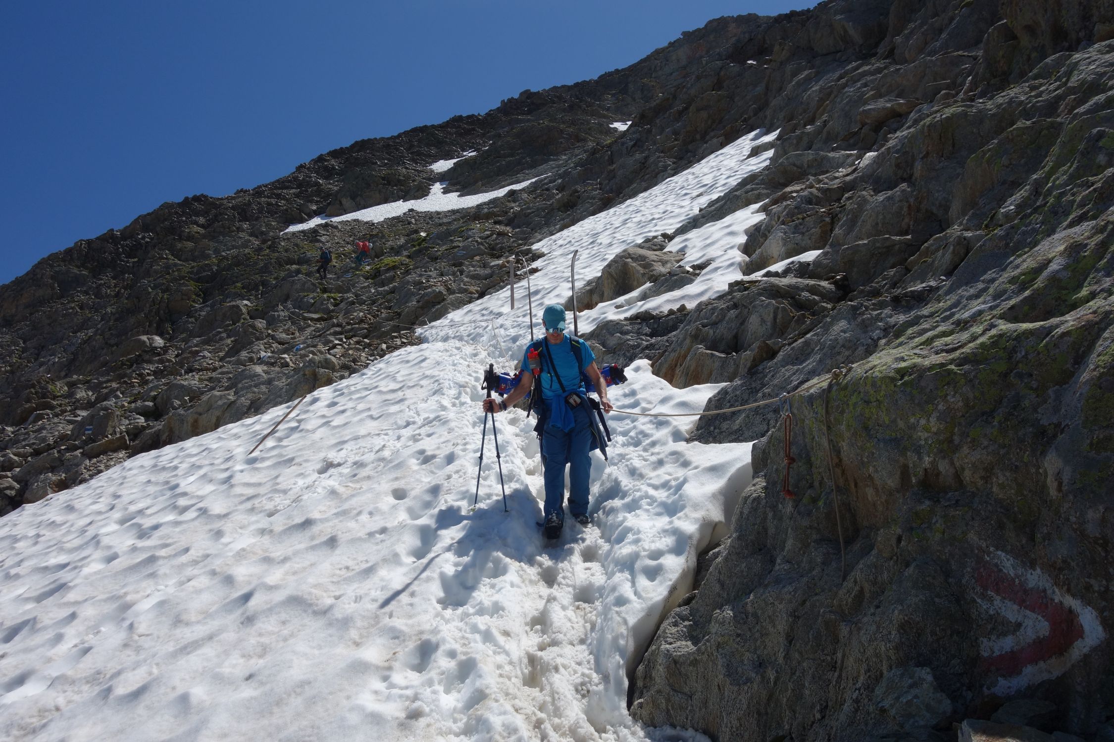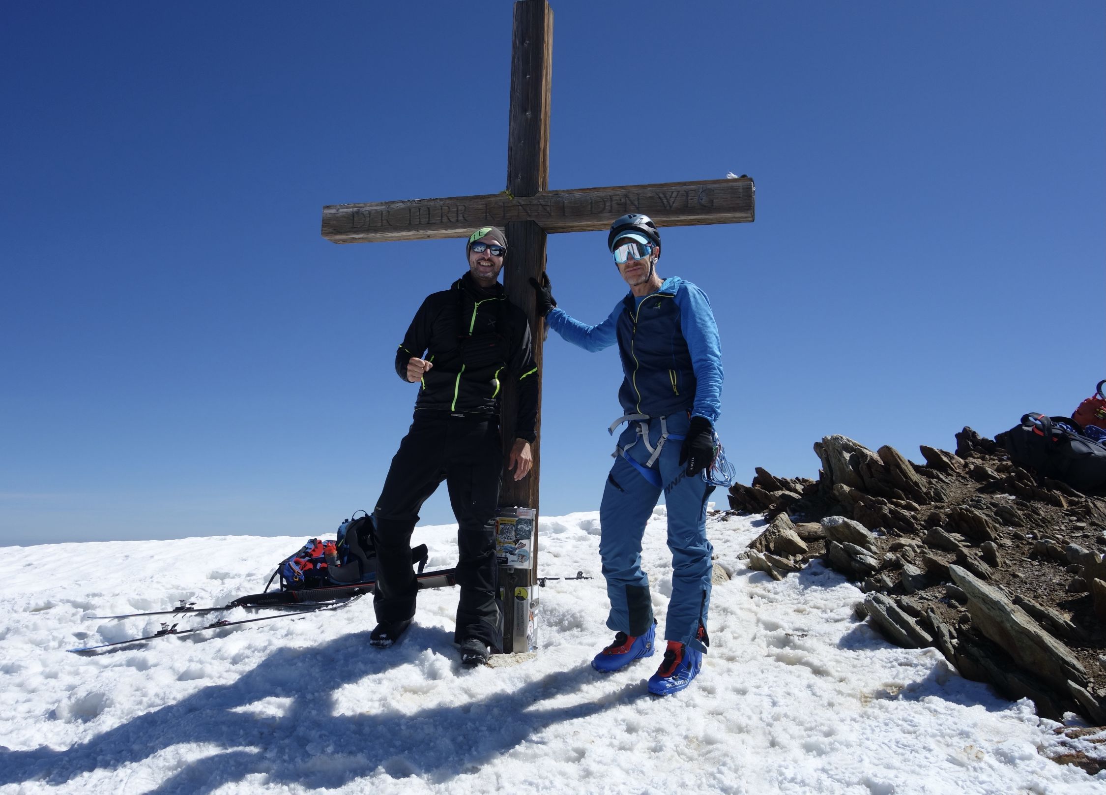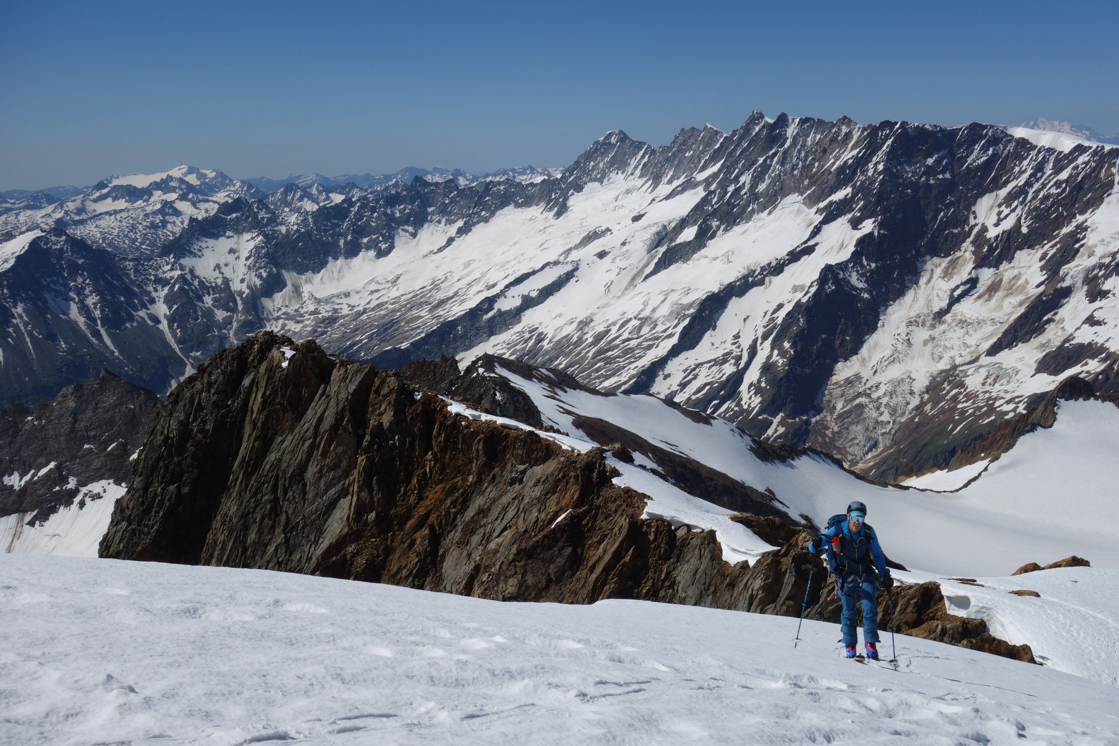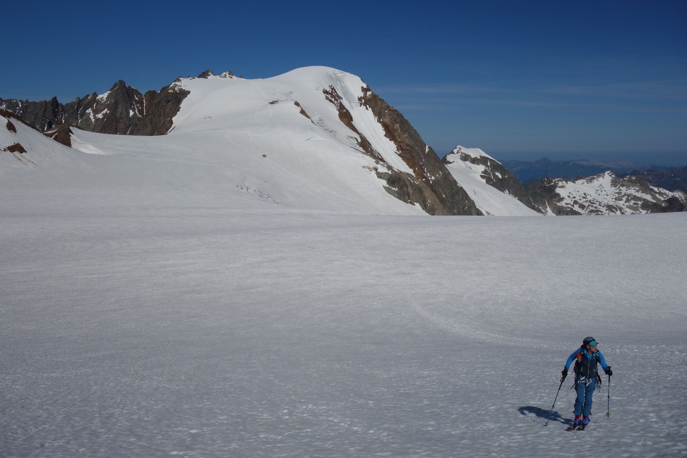 Last day of the season with light and shadow. We left at 6 from the last parking lot at the end of the private road at 2100. We walked up the path (often equipped and a bit difficult, shoes recommended) to the refuge. Then we put on skis on snow that had frozen hard thanks to the clear sky of the night despite the freezing point above 4000. Snow in bowls and frozen up to two hundred meters from the top. Not an easy climb, we put on crampons from 3100. Then a big block for the 3cm of new snow at the top. Only people on foot going up. At 1030 on the way down it had given up a bit, 4 stars at the top, two at the bottom. Here the shadows. We wanted to go down the slope on the orographic left of the refuge that you take all the way to the left going up a bit. After a bit of fiddling we gave up due to the lack of tracks and not being able to understand how much of an obstacle the ice and crevasses that could be seen halfway up the steep high slope could pose. The girl at the refuge didn't help us much, saying she didn't know the conditions but that in the last three days of great heat they had worsened a lot. End of story, great effort to walk down the ascent path and as soon as we reach the car we see two skialps (who knows where they came from?) who enter the slope and easily overcome the sections that from afar seemed more difficult, arriving ten minutes from the car .... Good dose of nerves .... But that's okay. Beautiful places, with Gabri.
