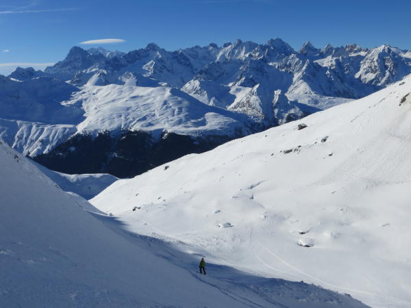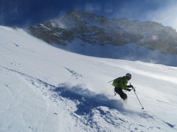 Schnee pulvrig bis Alp Boveire d'en-haut (10cm auf harter Unterlage), bis ca. 2800m (Gletscherbeginn) im Bereich der Moränen bei NW-Expo bis zu 30cm Pulver; 2800m-Col Panossière hart mit z.T. grossen Zastrugis >3300m. Gletscher bei Routenwahl immer im SW-Teil des Gletscherbeckens problemlos begeh-/befahrbar. Grat gut eingeschneit und im unteren Teil z.T. nicht sehr verfestigter Schnee (harte Spurarbeit). Oben raus verblasen und guter Trittschnee.