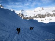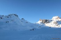 Zuerst schönes Wetter, dann hohe Wolken. Recht warm. Die Tour verläuft meist im Schatten. Bei der Abfahrt oft diffuses Licht und ungünstige Sichtverhältnisse.