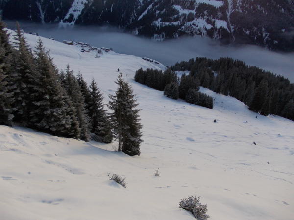 Abfahrt: Bis zur Tällihütte noch schöner Pulverschnee bei richtiger Abfahrtswahl. Nach Tenna raus Frühjahrs-Verhältnisse, aber gut machbar.