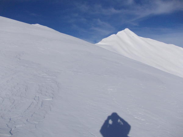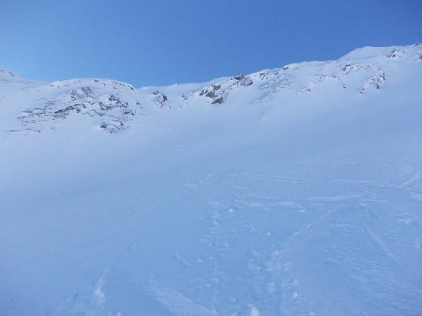 Aufstieg: Gute Verhältnisse. Die südwärts gerichteten Lawinenhänge an der Nolla waren alle entladen. Siehe Fotos.