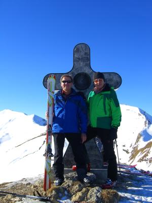 Der untere Teil der Strasse ist vielerorts aper und die Skier mussten unzählige Male ab- und angeschnallt werden. Ein willkommenes Dynafit-Training für Ruedi auf seiner zweiten Skitour! In einer guten Aufstiegsspur (im Schlusshang mit Harscheisen) zum Gipfel. DÄDI, DUI HESCH DAS SUPER GMACHT!!! Der Schnee war bei der Abfahrt entgegen unserer Erwartungen gut fahrbar.