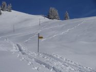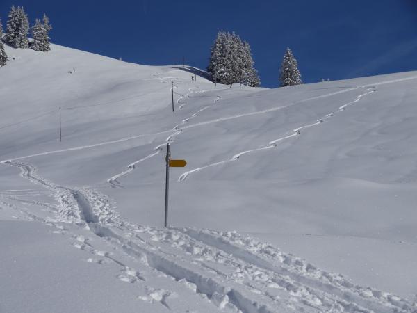 Schöner Pulverschnee. Ganz unten 5-10 cm. Oben 30-40 cm. Bis 1150 ohne Unterlage, aber trotzdem schön zu fahren, da keine Steine.