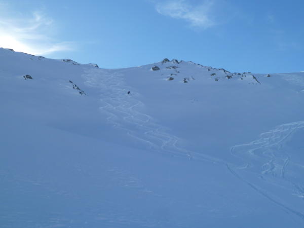 Der Neuschnee ist mit dem Altschnee noch nicht überall verbunden.Zwischendurch auch Triebschnee (nicht in steilem Gelände) der gebremst hat...
