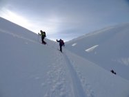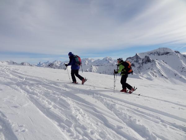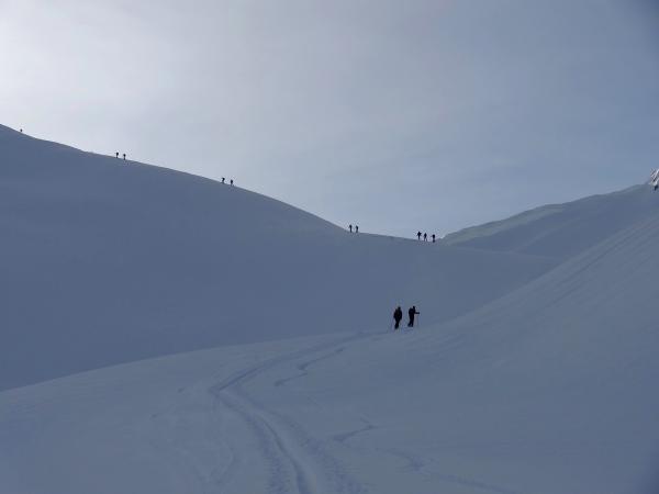 Nach diesem Samstag ist das Rauflihorn stark zerfahren. Mit ein wenig Fantasie findet man noch etwas Raum. Ich möchte dem Spurer oder den Spurern danken, die eine wunderbare Spur in den Gipfelhang gezogen haben. Im Zeitalter der steilen Spuren, ist es eine Wohltat eine normale Spur zu finden, die auch dem Senior oder dem Anfänger ermöglicht, zügig und nicht "auf dem letzten Zacken" hinaufzukommen. Chapeau!