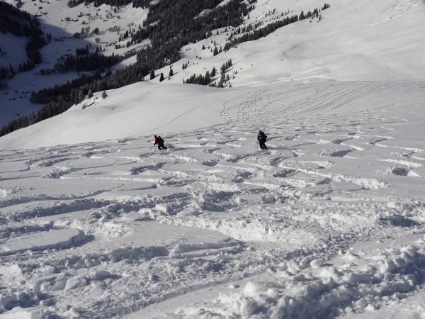 Sehr gute Schneeverhältnisse. Im Gipfelhang harmlose Windverwehungen. Bis zum Alpsträsschen mehr als genügend Schnee, dann wird durch das viele Befahren, das zeitweiligen Fehlen der Unterlage sichtbar oder auch hörbar. Zwischen Nidegg und Senggweid nicht den Steilhang rechts befahren (wenig oder keine Unterlage), sondern eher nach links unten tendieren und parallel zum Schneeschuhtrail bis zur Langlaufloipe fahren.