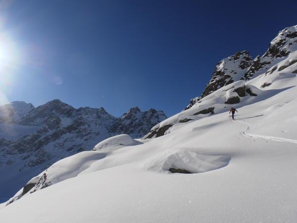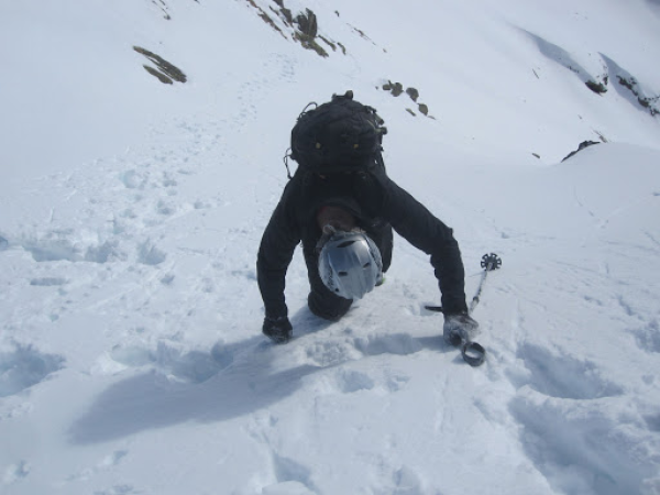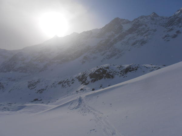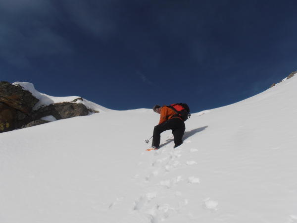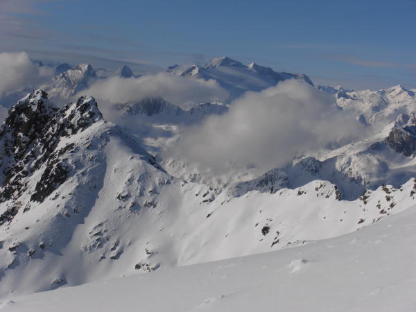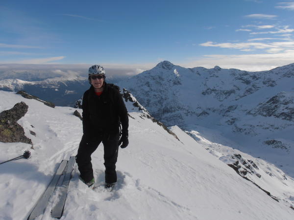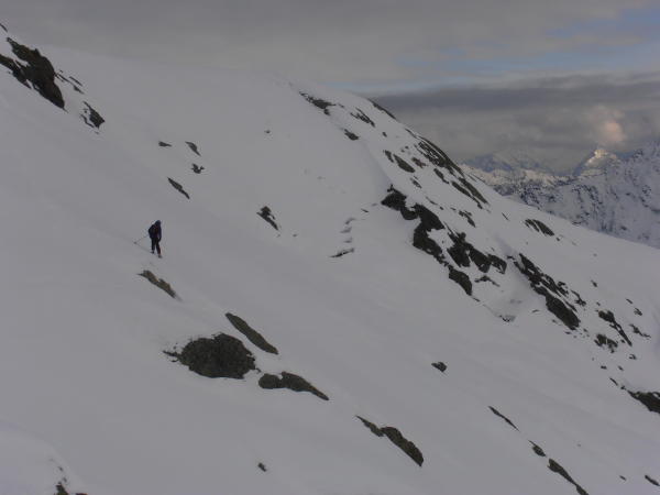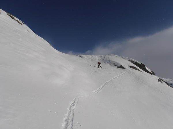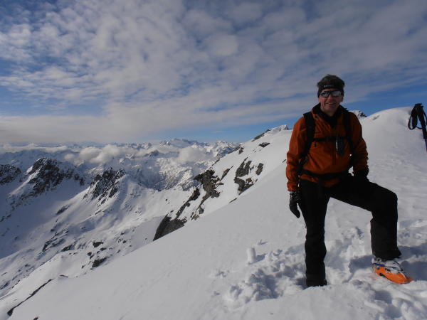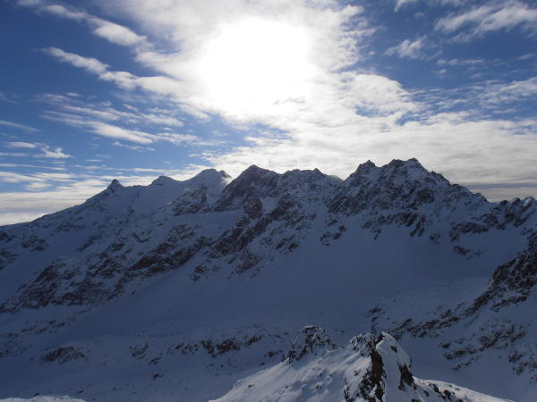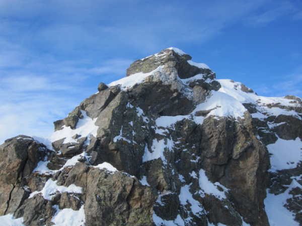 Wir wollten noch den höchsten Punkt besteigen und versuchten es über den steilen Südhang. Kamen aber nur bis auf den Grat vor dem Gipfelaufbau, dann versperret uns eine Risenwächte den Weiterweg. Wir denken der höchste Punkt, Gipfel wird nur sehr selten bestiegen. Wäre froh über Besteigungsinfo im Winter! Im SAC-Führer wird nur der Gipfelfirst östlich des Gipfels erwähnt.