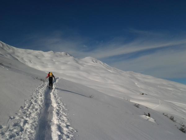 Gute Aufstiegsspur von Arflina bis Vorgipfel Glattwang, zum Gipfel nur Schneeschuhspur über den Gipfelgrat am Schluss. Wir sind links knapp unter dem Gipfelgrat durchgequert und zuletzt noch kurz zu Fuss auf den Gipfel.