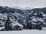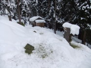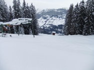 Auf dem Güterweg zur Hochegga kam mir gegen 09:00 Uhr der Förster lange Zigarre rauchend auf seinem Schneescooter mit seinem Jägerhund freudig entgegen, von der Wildfütterung kommend. Diese war reichhaltig aufgefrischt und einige Rotwildvertreter trieben sich dort herum.