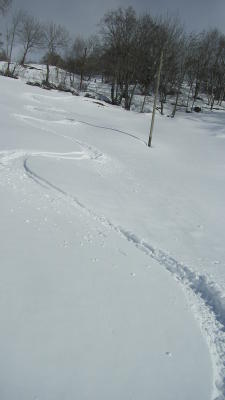 Die Südrampe habe ich noch nie so gut eingeschneit erlebt. Teils noch Pulver, teils hart, aber immer gut zu fahren. Bis 50 Hm oberhalb der BLS-Linie nahe B`hof Lalden gefahren, einige Zäune überstiegen.