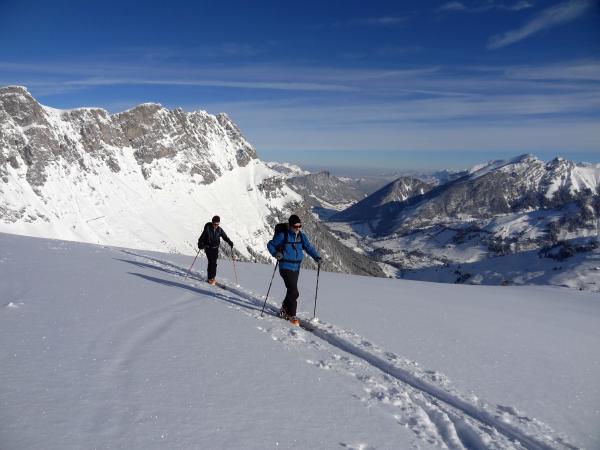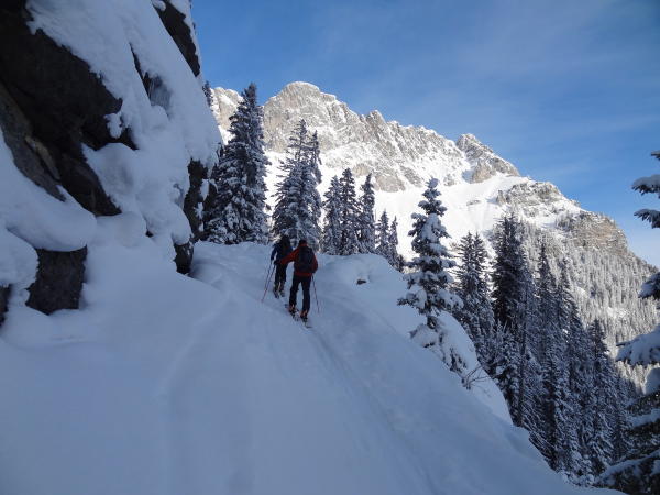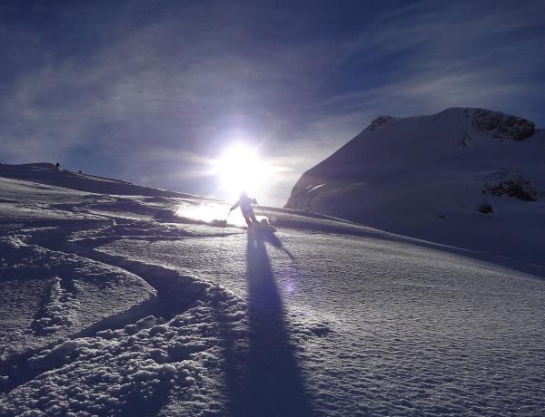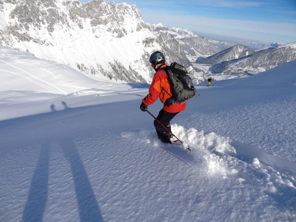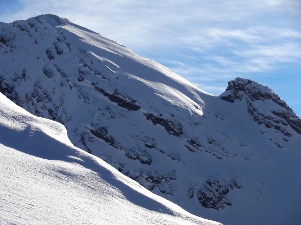 Mit der Wärme wird der Schnee etwas feuchter aber immer noch gut zu fahren.Was eigentlich fehlt, ist eine kompakte Unterlage die bis zum Boden durchgreift. Steile Hänge und Couloirs sind immer noch mit Vorsicht zu geniessen.