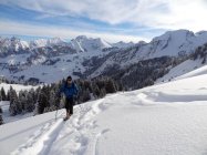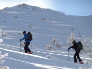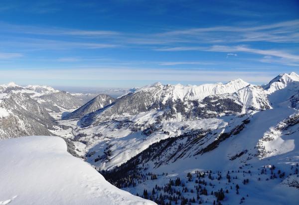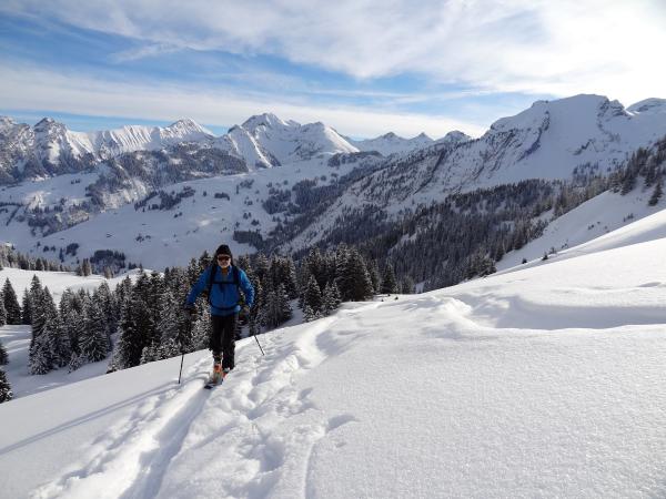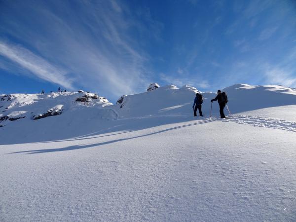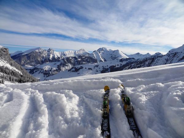 Sehr gute Schneeverhältnisse.Ungleich abgelagerter Pulverschnee. Meistens mehr als genügend. Wo der Wind gewirkt hat, Risiko von Stein Kontakt. Dies vor allem bei unserer Abfahrt auf dem Rücken Richtung Alpetli. Hier bei der Abfahrt eher links bleiben. Das Chelli sei hingegen sehr gut und steinfrei lt. Mitteilung.