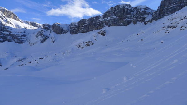 An den extremen Steilhängen in der Umgebung die üblichen Abgleitungen. Bei Abfahrt 2x kleine, leichte Rissbildung. Aber keine Wummgeräusche. (kann aber auch nur die oberste gefrohrene Schicht gewesen sein).