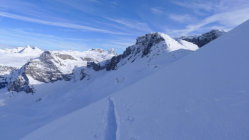 Unsere Spur legten wir einige Höhenmeter weiter oberhalb der Senke etwas riskant durch den bis zu 36 Grad steilen Hang. Ging gut. Schnee war fest. Aber nur einzeln und mit grösster Vorsicht begehen. Ansonsten alternativ in der Senke weiter östlich und dann links hoch zum Grat stechen.