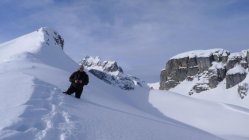 Abfahrt Richtung Osten Absolut unverfahrenes Glände über die ganze Strecke. Leider hatte der Schnee hier schon den Pulver platt gedrückt, was das Abfahrtsvergnügen etwas schmälerte. Aber noch nicht Bruchharst.