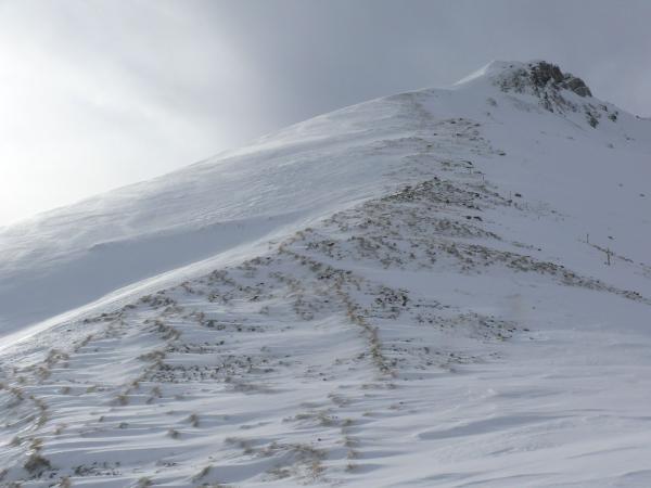 Von Nord-Gipfelmulde (sehr steil (>35°) im oberen Bereich) würde ich abraten, obwohl heute von Großgruppe (12 Personen) gemacht, da massive Windschattenseite bei Föhnstürmen über 2 Tage