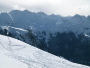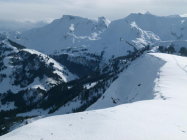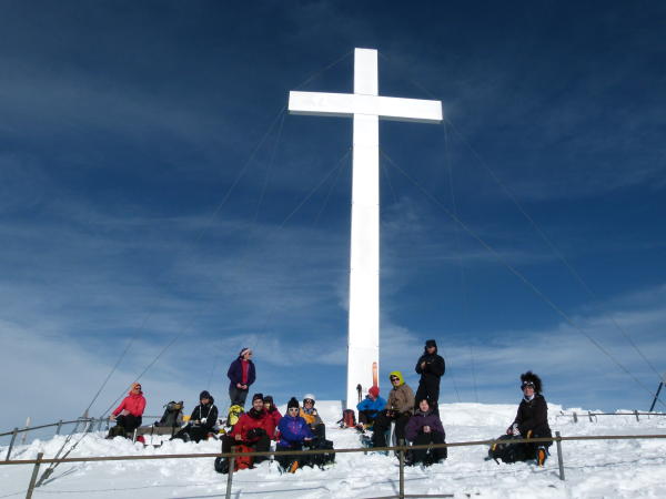 Überraschend wenig Schnee, apere Stellen. Der 200 Höhenmeter Gipfelhang ist besonders schwach mit Schnee dotiert.