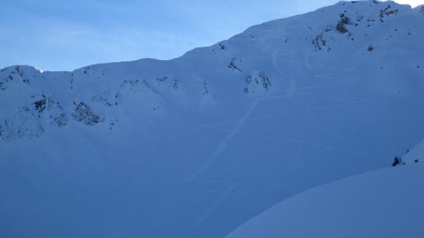 Abgesehen von wenigen windgepressten Stellen herrliche Pulverschneeverhältnisse! Im Gipfelbereich vom Winde verweht!