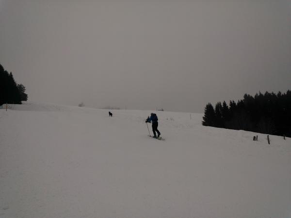 Leider waren wir unterhalb der Nebelgrenze. Dennoch sehr gute Verhältnisse, in der Abfahrt genug Sicht und obgleich zerfahren konnte man auch noch etwas Tiefschnee (Pulver würde ich dem nicht mehr sagen) finden. Wem das nicht behagt, kann auf der Piste problemlos runter.