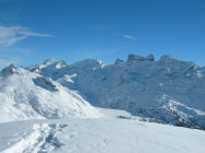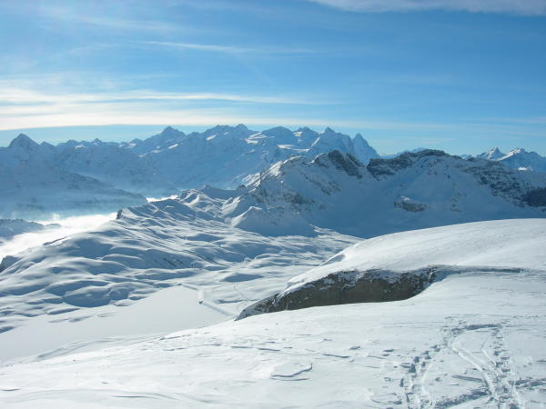 Ein bisschen von allem: windgepresst tragend, windgepresst nichttragend, Pulverschnee. Dennoch bei dem heutigen schoensten Wetter einigermassen lohnend.