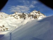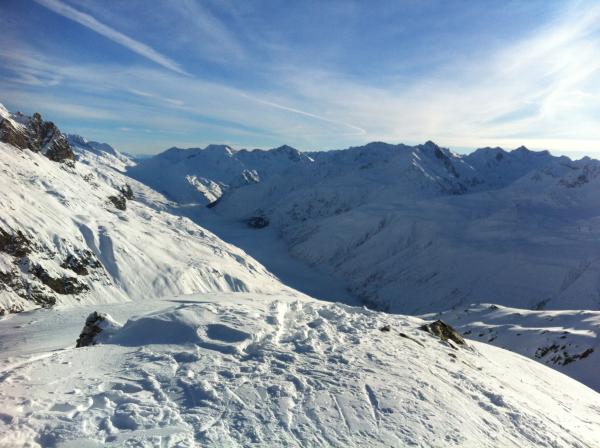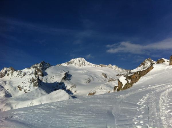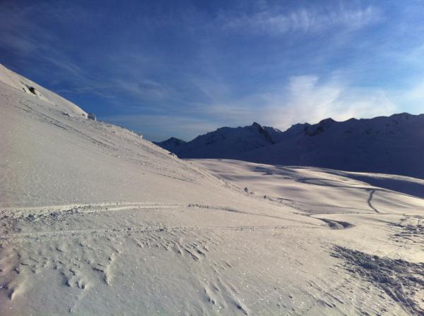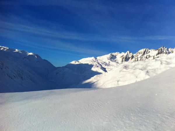 Erstaunlich guter Schnee, 20cm Neuschnee auf guter Unterlage. Kein Bruchharsch, Minimal Windgepresster Schnee im Gipfelbereich.