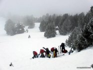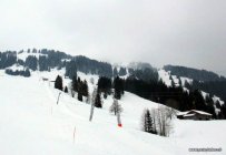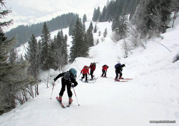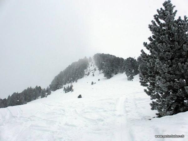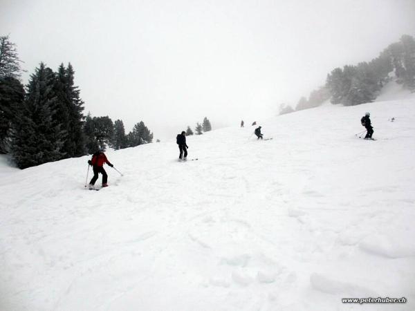 Bedeckt, Nebel, leichter Schneefall. Für die Abfahrt war die Sicht OK. Es hat zirka 2 cm Neuschnee auf die schon ziemlich verfahrene Unterlage gegeben. Der bisherige Schnee ist noch recht pulverig. Es hat immer noch genug. Weit aussen fanden wir noch wenig verspurte Hänge.