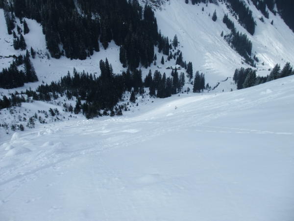 Spur geht über die Flanke und folgt nur kurz dem Wanderweg. Durch körnigen Schnee manchmal seifig aber insgesamt gut zu gehen. Ansonsten sehr gute Pulververhältnisse mit ganz leichtem Deckel im Gipfelhang. Bis 2000 Meter Nebel, drüber wolkenlos. Die Hänge sind weit genug für eigene Spuren. Denke das wird sich ab Morgen ändern. Winterhorn N-Flanke wurde auch gemacht. Sieht auch sehr gut aus.